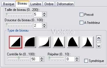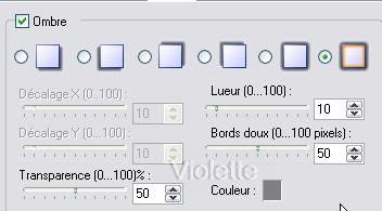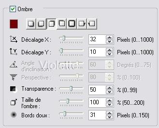 répéter une seconde fois 8 - Photo/Affiner/Affiner/Options: 20 9 - Activer votre tube Suzi SS_1453 Edition /Copier/Edition/Coller comme objet Aligner sur le côté gauche 10 - Objet/Ombre/case 3 avec les valeurs ci-dessous : couleur #370004