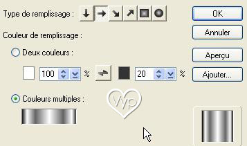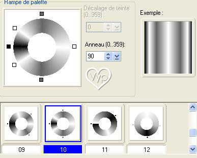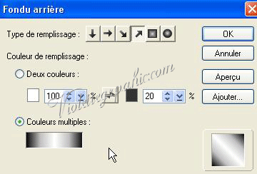 2 – Installer la couleur #FF0000 en avant-plan, et la couleur #810100 en arrière-plan Faire une petite perle "or" ICI ( au n° 10 ) 3 – Ouvrir une image fond blanc 500 x 500 pixels/remplir de couleur foncée 4 - Edition/Fondu arrière /n°7/diagonale