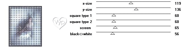clic droit/Désélectionner 15 - Ajuster/Etendre le canvas/ 1 pixel couleur blanche/ Sélectionner avec la baguette magique Remplir de motif or 16 - Ajuster/Etendre le canvas/ 5 pixels couleur foncée 17 – répéter n° 15 18 - Ajuster/Etendre le canvas/ 15 pixels couleur foncée/ Sélectionner avec la baguette magique Remplir de couleur foncée 19 – Effets/Kang 2/Squareville