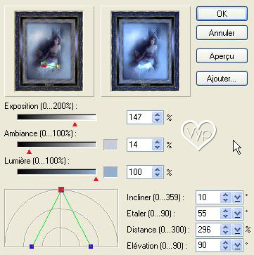 6– Edition/remplir de couleur claire 7- Sélection/Sans 8- Palette Magique/Amélioration d’images/Particule/nuages/ Double Clic sur nuage 4 9 – Activer le tube/Ajuster/Redimensionner à 85%/ Edition/Copier/ Edition/Coller10 - Photo/Mise au point/Option/ Ajustement auto/OK 11 – Objet/Fusionner tout 12 – Ajuster/Etendre le canvas: 1 pixel blanc/Sélectionner avec la baguette magique Remplir de couleur foncée 13 - Sélection/Inverser 14 - Eye Candy 3.01/Cutout /couleur de l’ombre blanc