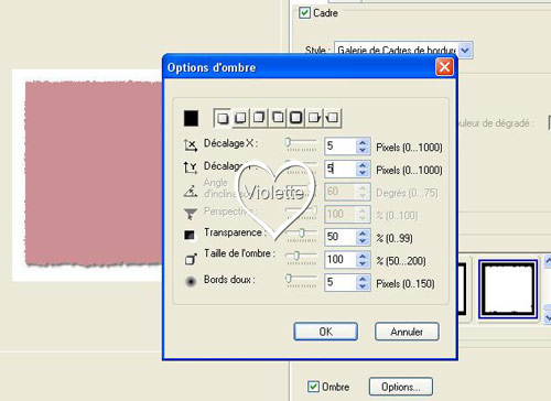2 - Ouvrir une image de 650 x 600 pixels fond blanc 3 – Edition/Remplir de couleur #CD949A 4 - Galeries/Galeries de cadres photos/ Bords Prédéfinis