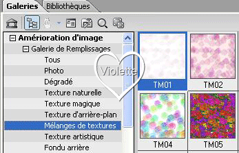 12 - Ouvrir une image de 350 x 410 pixels fond blanc 13 – Palette Magique/Galerie de Remplissage/Mélange de textures/ clic droit sur la texture TM 01