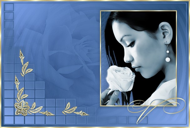 16 - Sur le tube Femme Edition/Copier/Revenir sur le petit cadre/Edition/Coller comme objet. 17 -Objet/Ombre/la 4ème/couleur dans les tons du dégradé/bords doux : 38. Désélectionner. Fusionner tout. 18 -Ajuster/Etendre le canvas/Etendre de façon égale/3 pixels couleur blanche. Sélectionner avec la baguette magique/Double-cliquer sur la texture or. Clic droit/sans. 19- Edition/Copier/Coller sur le tag/Disposer à droite Ombre/la 5ème taille de l’ombre :102 couleur de l’ombre : noir. Désélectionner. 20 – Edition/copier/coller les tubes décos sur le coin gauche. 21 – répéter le n°18. 22- Signer/Objets/Fusionner tout. 23- Enregistrer en JPG Optimisé à 80%.