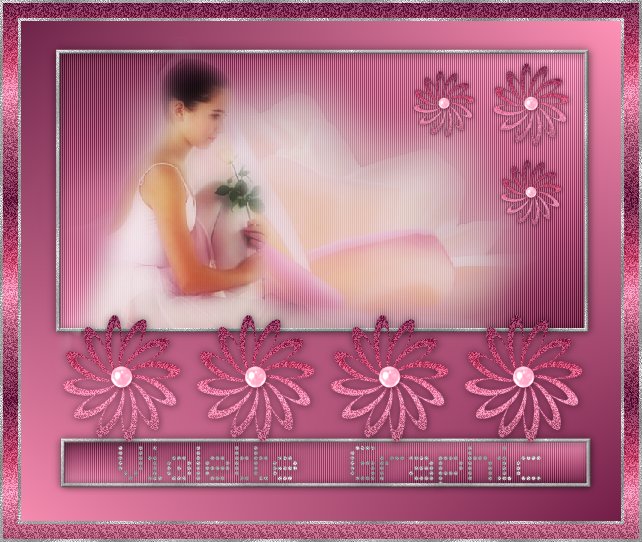 10 - Ouvrir une image de 600 x 500 fond blanc dans la Palette Magique/Galerie de Remplissage/Double-cliquer sur le dégradé G13 Mettre de côté. Cette image est le fond du tag. 11 - Ouvrir une image de 535 x 285 fond blanc dans la Palette Magique/Galerie de Remplissage/Double-cliquer sur le dégradé G13 12 - Dupliquer/Convertir de texte/chemin en image/ double-cliquer sur la texture argent dans la barre des menus passer en 3D tuyau/ boîte de matériaux/biseau à 3. Touche Entrée pour désélectionner 13 – Sélectionner la couche de dégradé/ Effets/Remplissages et textures/textures/store Clic droit/sélectionner tous les objets/ Objets/Fusionner tout. Mettre de côté. 14 - Ouvrir une image de 535 x 45 répéter n° 11/12/13. 15 – Reprendre le fond du tag. Sur chacun des tableaux. Edition/copier/Edition/coller comme objet. Aligner/centrer horizontalement. 16 - Reprendre le motif fleur laissé de côté. Ajuster/redimensionner à 80%. Edition/Copier/Edition/coller sur le tableau Dupliquer/redimensionner à 80° Dupliquer. 17 - Disposer les 3 fleurs comme sur le modèle en vous aidant des commandes Aligner. Objet /aligner/au sommet/Aligner/Espacer régulièrement/horizontalement. 18 -Clic droit/sélectionner tous les objets/fusionner en un seul objet. 19 – Copier/coller le tube femme/Ombre la 2ème par défaut. 20 -Ajuster/Etendre le canvas/Etendre de façon égale/3 pixels couleur blanche. Sélectionner avec la baguette magique/Double-cliquer sur la texture argent. Clic droit/sans. 21 - Ajuster/Etendre le canvas/Etendre de façon égale/15 pixels couleur blanche. Sélectionner avec la baguette magique/Double-cliquer sur la texture chargée Entrée pour désélectionner. 22 – Répéter n° 20. 23 - Signer/ Objets/Fusionner tout. 24 - Enregistrer en JPG Optimisé à 80%.