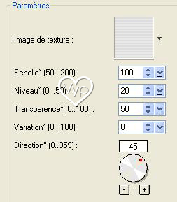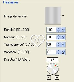 7 – Ouvrir la sélection selvypselima.ufo/Edition/Copier Edition/Coller comme objet sur la représentation Désélectionner 8 - Sélectionner la couche 01 (l'objet 5) Edition/Remplir de couleur :#be223f 9 - Effets/Effets de remplissage et de textures : Filtre texture/texture store01 :
