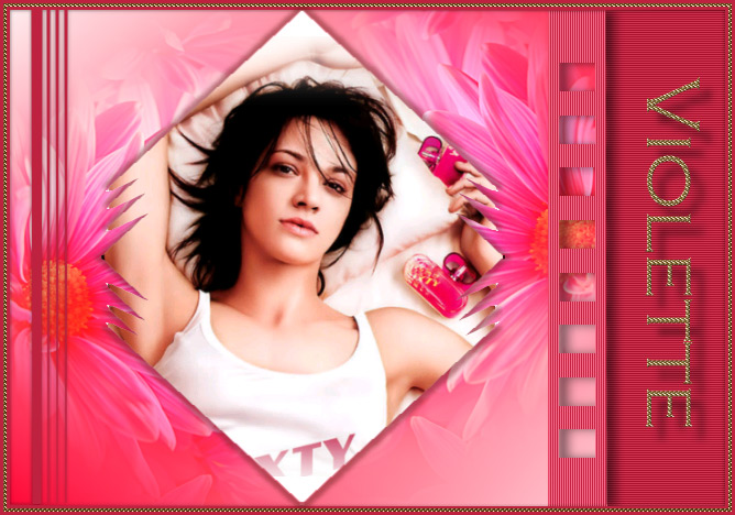 22 - Ajuster/Etendre le canvas/Etendre de façon égale/3 pixels/couleur blanche Sélectionner avec la baguette magique/Double-cliquer sur la texture or. 23 - Ajuster/Etendre le canvas/Etendre de façon égale/3 pixels /couleur #be223f 24 – Signer avec une jolie police Tourner à 90° droite et placer sur le côté droit 25 - Objets/Fusionner tout 26 – Enregistrer en JPG Optimisé à 80%.