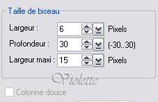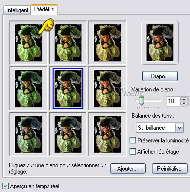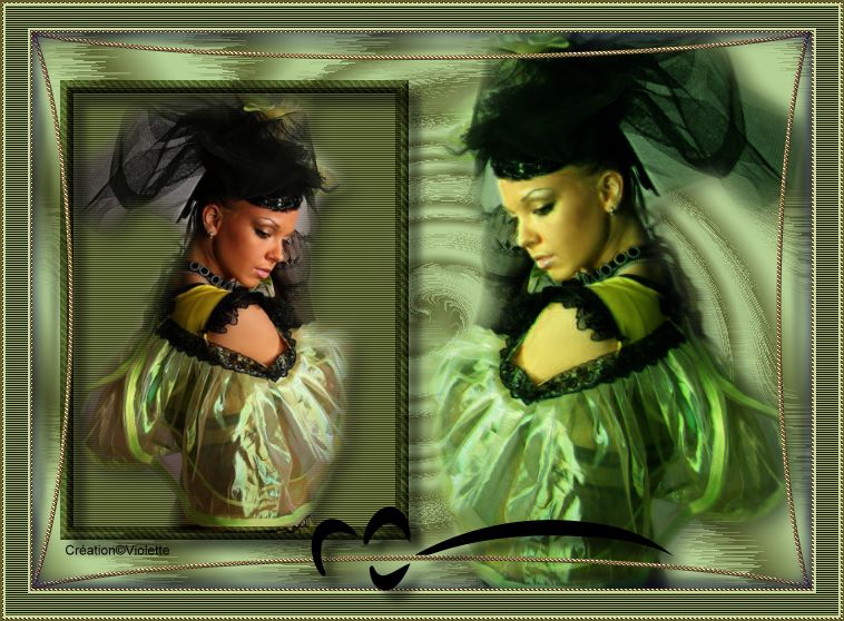 Objet/Fusionner Tout 13 - Ajuster/Etendre le canvas de : 2 pixels couleur noire sélectionner à l'aide de la baguette magique /sélection/inverser Eye candy 3/cutout par défaut Désélectionner 14 -Sélectionner de nouveau la bordure noire Dans la Palette Magique / double-cliquer sur la texture "or" perle Désélectionner 15 - Ajuster/Etendre le canvas de : 2 pixels couleur #c2dfa0 16 - Ajuster/Etendre le canvas de : 20 pixels couleur #58912c sélectionner à l'aide de la baguette magique répéter l'effet store Photo/Affiner/Affiner Désélectionner 17 - Ajuster/Etendre le canvas de : 2 pixels couleur #c2dfa0 18 - Ajuster/Etendre le canvas de : 2 pixels couleur noire Sélectionner la bordure noire à l'aide de la baguette magique Dans la Palette Magique / double-cliquer sur la texture "or" perle Désélectionner 19 - Ajuster/Etendre le canvas de : 1 pixel couleur #58912c 20 – Signer 21 – Objet/Fusionner Tout 22 – Exporter en JPEG Optimisé