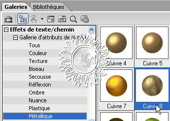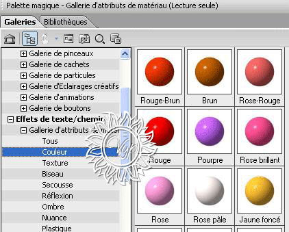 2 - Ouvrir la Palette Magique/Effets de textes/Chemin/Galleries d’attributs de matériaux/couleur :