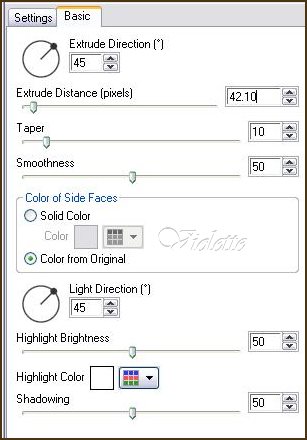 13 - Effets/Eye Candy 5 Impact/ Extrude : Large Offset, 45 °Onglet Basic: Ajuster/Redimensionner à 70%/sélectionner "Objet sélectionné" 14 - Objet/Ombre/La 3ème par défaut :