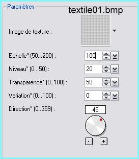 6 - Sur la couche du cercle Effet/Remplissage et Textures/Filtre Texture/En relief Appliquer la texture textile01.bmp :