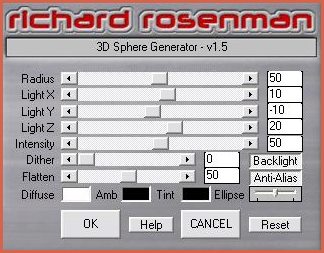 13 – Ouvrir une nouvelle image transparente de 250 x 250 pixels 14 - Effets/ Richard Rosenman/ 3D Sphere Generator avec ces réglages: