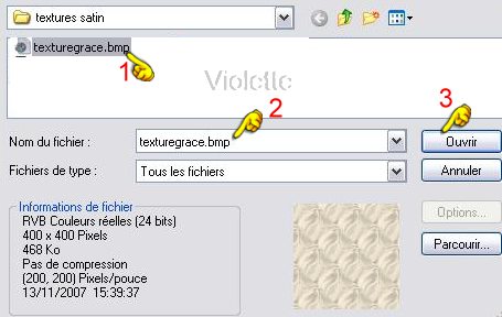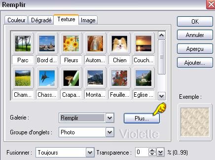 *** 1 - Ouvrir vos tubes, les dupliquer et fermer les originaux Placer la texture dans votre dossier personnel texture 2 - Fichier/Nouvelle image/600 x 450 blanc 3 - Edition/Remplir aller cherche la texture dans le dossier où vous l'avez rangée