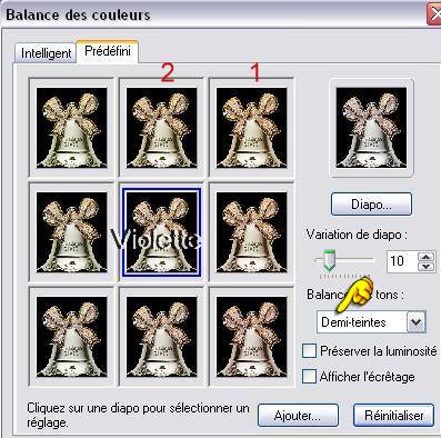 17 - Activer votre tube "Yoka_Misc_XMassBells" Ajuster/Redimensionner deux fois à 80% et une fois à 90% Photo/Couleur/Balance des couleurs : cliquer une fois sur la troisième vue puis une fois sur la seconde