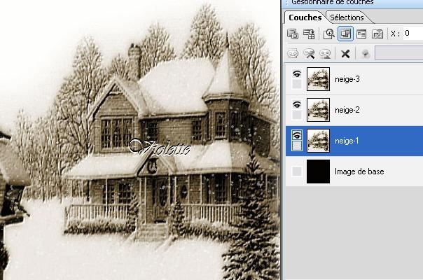 9 - Sélectionner neige 1 : Edition/Copier revenir sur votre couche "Obj-1" de votre travail Edition/Coller/Ajuster à la sélection répéter avec neige 2 et neige 3 : vous renommer toutes vos couches ainsi :