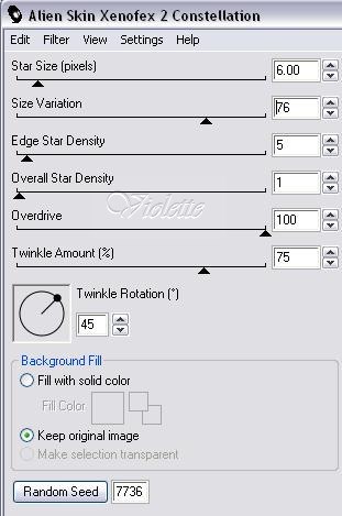 17 - Se placer sur le fond 2 Sélection/Charger la sélection Effets/Xenoflex/constellation : clic une fois sur Random