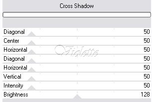 22 - Ajuster/Etendre le canvas : 25 pixels couleur #abbc96Sélectionner avec la baguette magique Effets/Graphic Plus/Cross Shadow avec ces réglages: 7 x 50 + 128 x 1