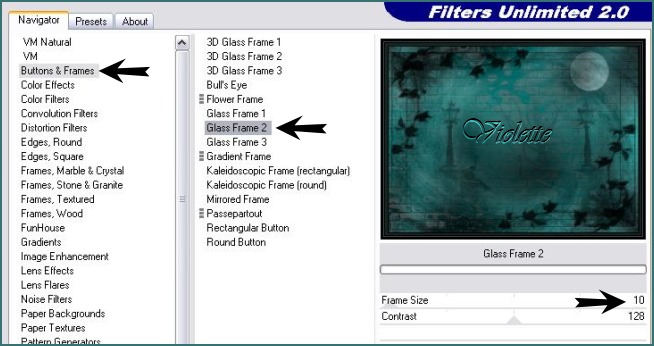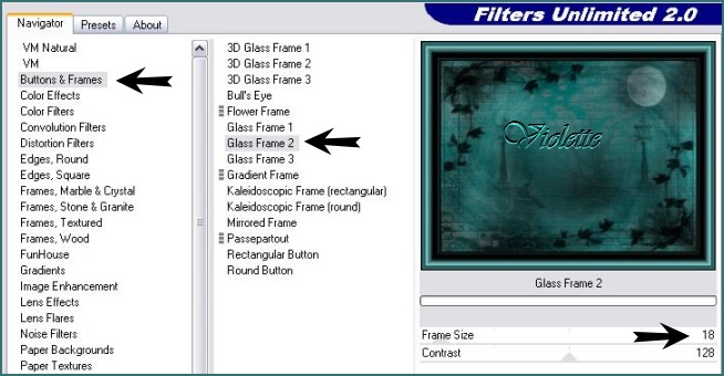 Clic droit/Désélectionner Sélectionner avec la baguette magique 16 - Effets/Unlimited/Buttons and Frames/Frame Glass 2 avec ces réglages: