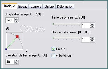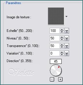 17 - Effets/Remplissages et textures/Filtre texture /Effet: en relief/sélectionner la texture "textile2.bmp" Avec ces réglages