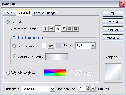 2 - Ouvrir une nouvelle image de 700 x 550 fond blanc clic droit/Tous 3 - Edition/remplir/Couleurs Multiples /Sélectionner votre nouveau dégradé Type de remplissage : diagonale
