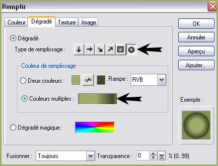 *** 1 - Ouvrir vos tubes, les dupliquer et fermer les originaux Placer en avant-plan la couleur #3f4927 (la couleur foncée du tube) et en arrière-plan la couleur #9dae6a (la couleur claire du tube) Créer votre dégradé ( Tuto ICI ) Dans la Palette des dégradés former un dégradé linéaire: