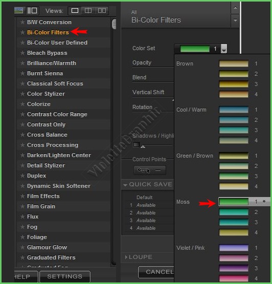 27 - Activer le calque inférieur Effets / Nik Color efex Pro /Bi-color/ réglages suivants : * Voyez ce qui convient le mieux à votre tube!