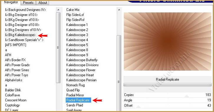 3 - Calques/Dupliquer Effets/ &<Bkg Kaleidoscope/ Radial Replicata réglages suivants :