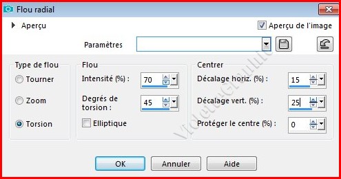 **Réglages/Flou/Flou radial réglages suivants :