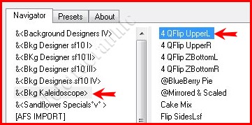 7 - Calques/ Dupliquer Fermer ce calque en cliquant sur l'oeil Activer la copie de calque 1 (calque intermédiaire) **Effets / Unlimited 2.0 / & <Kaleidoscope BKG> / 4 QFlip UpperL