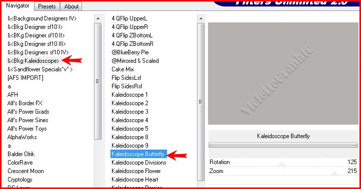 8 - Ouvrir et activer la copie (2) du raster 1 **Effets/ Unlimited 2.0 /& <Kaleidoscope BKG>/ Kaleidoscope Butterfly