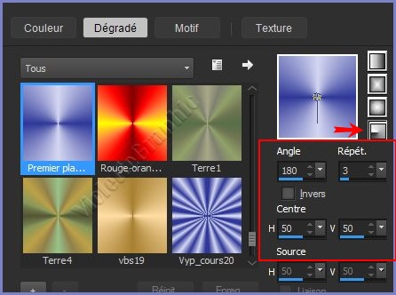 **Configurer un dégradé radial angle: 180°/Répétitions : 3/Inverser non coché