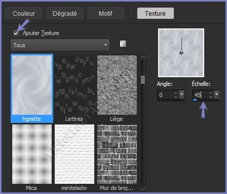 10 - En premier-plan replacer votre couleur #d2d4f2 Rechercher votre texture hgmitte configurée ainsi : angle: 0/ échelle: 45