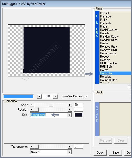 3 - Calques/Dupliquer Effets /UNplugged/VanerLee/Rotocube réglages suivants :