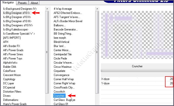 5 - Effets/Unlimited/& <Bkg Designer sf10I> / Cruncher réglages suivants :