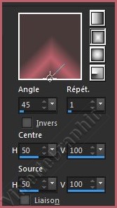 ** Placer en premier-plan la couleur #473b39 et en arrière-plan la couleur # bb616bConfigurer un dégradé rectangulaire/Angle : 45°/ Répétition: 1/Inverser non coché Centre: hor.=50/ vert.=100 Source: hor.=50/ vert.=100