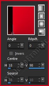 ** Placer en premier-plan la couleur #e7001d et en arrière-plan la couleur #0e0000Configurer un dégradé radial/Angle : 0°/ Répétition: 0/Inverser non coché Centre: hor.=18/ vert.=98