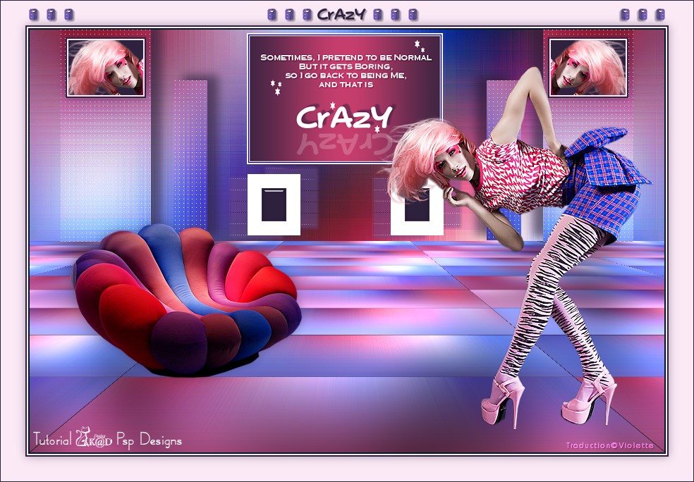 Merci beaucoup à Karin de m'avoir donné l'exclusivité de la traduction française de ses tutoriels*** *** Ces traductions m'appartiennent Il est strictement interdit de les copier ou de les distribuer sur le Net Les tutoriels sont la propriété de leurs auteurs *** 386 - Crazy vous trouverez l'original de ce tutoriel ICI *** Ce tutoriel a été réalisé dans PSP X8 mais peut être effectué dans les autres versions PSP Ces traductions m'appartiennent Il est strictement interdit de les copier ou de les distribuer sur le Net *** Pour faire ce tutoriel vous aurez besoin : Tubes : KaD_Woman_72 KaD_Furniture1 386_KaD_Deco1 386_KaD_Deco2 Sélection : 386_KaD_Alfakanaal.pspimage Masque : OBG_MASK_04 Preset : 385_KaD_InsaneRedGlow *** Filtres : ICI Mehdi / Wavy Lab 1.1 Illimité 2.0 - & <BKgDesigner sf10II / Streaker PSY (-) Toadies / Weaver Muhra Meister / Perspective Tile AP 01 (Innovations) Lines / Silverlining Alien Skin / EyeCandy5 Impact /Glass Graphics Plus / Cross Shadow *** *** Les tubes sont offerts à usage personnel Vous n'avez pas la permission de placer ces tubes sur un autre site sans la permission du créateur ***