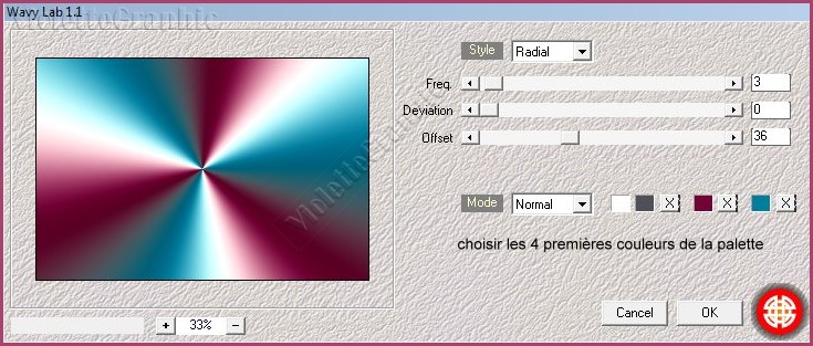 36 - Effets/Toadies/What are you? réglages suivants : 20/0 ( couleur arrière-plan #700533 ) **Calques/Dupliquer Image/Miroir/Miroir horizontal Calques/Fusionner le calque du dessous Mode de fusion : Ecran