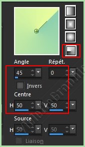 ** Placer en premier-plan la couleur #8dd0af et en arrière-plan la couleur #e7fc9dDans la Palette de Style Configurer un dégradé radial angle: 45°/Répétition: 0/Inverser non coché Centre: hor.=50/ vert.=50