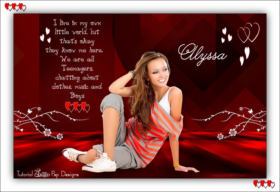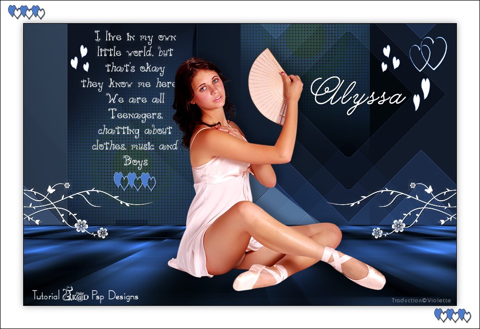 Merci beaucoup à Karin de m'avoir donné l'exclusivité de la traduction française de ses tutoriels*** *** Ces traductions m'appartiennent Il est strictement interdit de les copier ou de les distribuer sur le Net Les tutoriels sont la propriété de leurs auteurs *** 390 - Alyssa vous trouverez l'original de ce tutoriel ICI *** Ce tutoriel a été réalisé dans PSP X8 mais peut être effectué dans les autres versions PSP Ces traductions m'appartiennent Il est strictement interdit de les copier ou de les distribuer sur le Net *** Pour faire ce tutoriel vous aurez besoin : Tubes : KaD_Girl2 390_KaD_Deco1 390_KaD_Deco2 Background : 390_KaD_Background Pinceaux : Floral_Deco_Brushes_4_by_ro_sto_ / 390_KaD_TekstBrush ( à exporter en pinceau personnalisé ICI ) Masque : Narah_mask_0858.jpg Sélection : 390_KaD_Promise_Alfakanaal.pspimage Police: MelanyLane *** Filtres : ICI VM Toolbox / Trimosaic Toadies / What are You Simple / Centre Tile Unlimited 2.0 / Sapphire Filters 01 (-) HIER Mehdi/ Weaver Muhra Mester / Perspective Tiling Graphics Plus / Cross Shadow *** *** Les tubes sont offerts à usage personnel Vous n'avez pas la permission de placer ces tubes sur un autre site sans la permission du créateur ***
