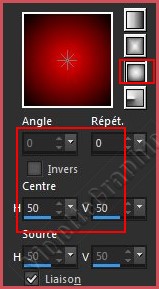 ** Placer en premier-plan la couleur #f20201 et en arrière-plan la couleur #000000Dans la Palette de Style Configurer un dégradé halo/Répétition: 0/Inverser non coché Centre: hor.=50/ vert.=50
