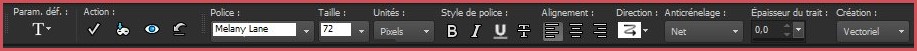 22 - Double-clic sur le police pour l'ouvrir **Activer l'outil Texte/Police MelanyLane/taille : 72/vectoriel/épaisseur du trait : 1 premier-plan fermé /couleur arrière-plan #ffffff