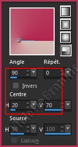 ** Placer en premier-plan la couleur #d4bfb5 et en arrière-plan la couleur #b2244dDans la Palette de Style Configurer un dégradé radial/angle: 90/Répétition: 1/Inverser non coché Centre: hor.=20/ vert.=70