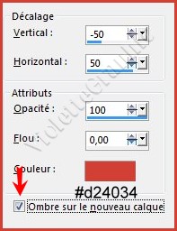 15 - Effets/Effets 3D/Ombre Portée : -50/50/100/0/couleur #d24034 ATTENTION : cocher "Ombre sur le nouveau calque "