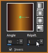 ** Placer en premier-plan la couleur #c27d20 et en arrière-plan la couleur #270c10Dans la Palette de Style Configurer un dégradé linéaire angle: 90°/Répétition: 1/Inverser coché