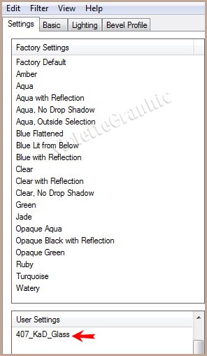 25 - Calques/Fusionner le calque du dessous Effets/ Alien Skin / Eye Candy 5 Impact /Glass Appliquer le preset 407_KaD_Glass