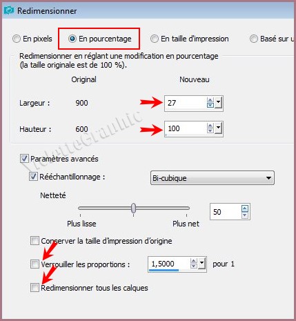 **Image/Redimensionner réglage suivants : 27/100 pourcentage / proportions et Redimensionner toues les calques décochés