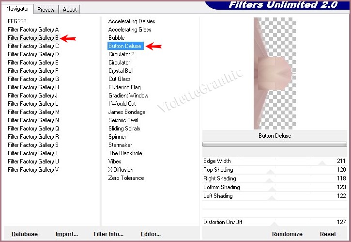 Effets/ Unlimited 2.0 / Filter Factory B/Button Deluxe réglages suivants :