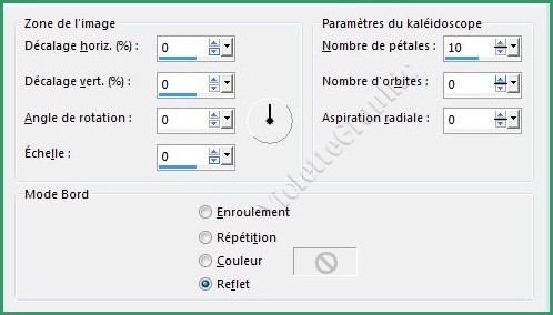 11 - Calques/Dupliquer **Image/Miroir/Miroir vertical **Calques/Fusionner le calque du dessous **Effets/Effets de réflexion/Kaléidoscope réglages suivants :