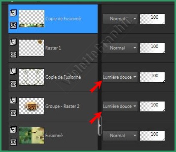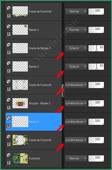 ** Calques/Réorganiser/Déplacer vers le bas Répéter une fois Mode de fusion: Eclaircir Opacité à 53%
