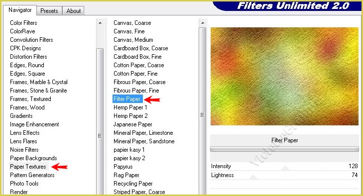 3 - Effets/Unlimited/Paper textures/Filter Paper réglages suivants :